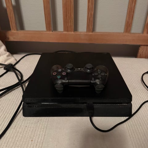 Playstation 4 spelkonsol med specialdesign som föreställer Darth Vader. Konsolen är svart med grafiska detaljer och levereras med två trådlösa handkontroller i blått och guld samt ett urval av spel. Passar för användare som vill spela Playstation 4-spel.