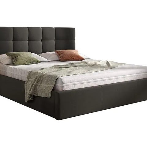 IKEA kontinentalsäng med beige tygklädsel, stoppad huvudgavel och svarta ben. Beige sängkappa (modell ”Mosterhamn”) ingår om så önskas.