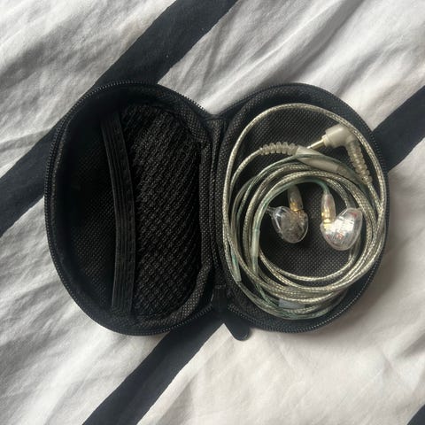 Shure SE535 in-ear hörlurar med svart färg. Hörlurarna levereras med förvaringsetui och flera par öronproppar i olika storlekar för anpassad passform. Designade för att ge hög ljudkvalitet och komfort vid användning.