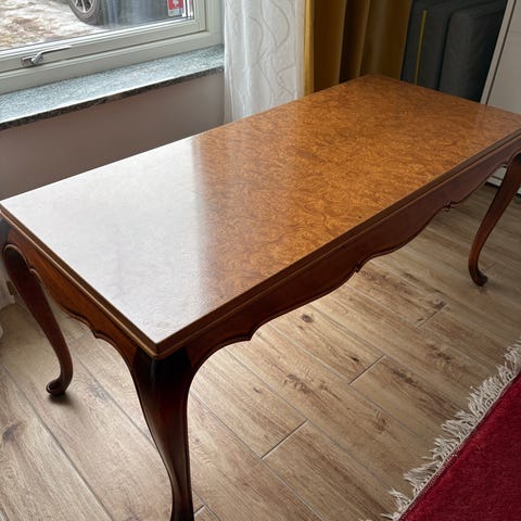 Gammalt soffbord med lejonhuvuden och tassar. Benen/lejonen är snidade i solitt trä, bordsskivan är faner. Ålder okänd, kan vara mitten 1900-tal, sekelskifte eller ännu äldre. Bra skick för sin ålder, men det finns någon fläck på skivan och små skador i faneren, se bilder.