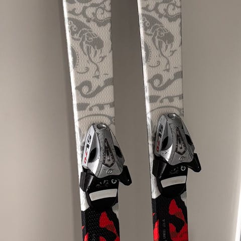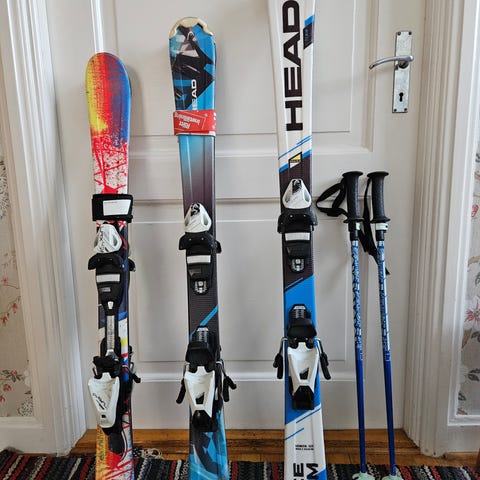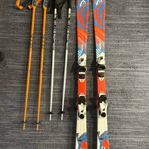 Barnskidor, 139 cm med stavar, hjälm, ryggskydd