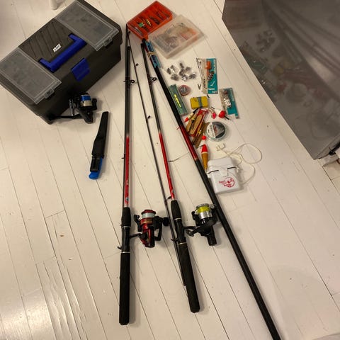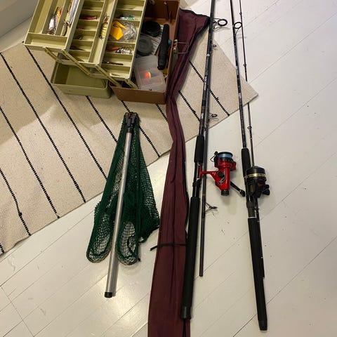 Flera olika fiskespön och fiskeredskap i varierande storlekar och färger. Sittlåda med förvaring har använts för isfiske