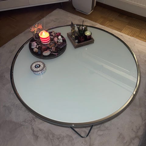 Rymligt runt soffbord med två glasskivor i svart och kanter i silver. Fint skick. Vet inte märke.