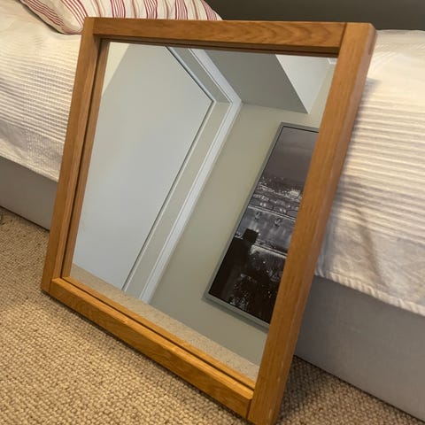Spegel i massiv oljad ek, använd som hallspegel, fungerar förstås också som sovrumsspegel. Tung!