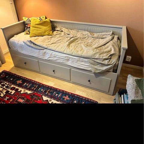 Dagbädd i vitt med utdragbar låda under sängen som kan användas som extrasäng eller förvaringsutrymme.