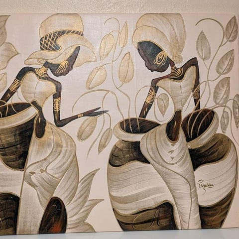 Tavla med motiv av två rosa blommor mot mörk bakgrund. Inramad med guldfärgad ram. Passar för väggdekoration i olika rum.