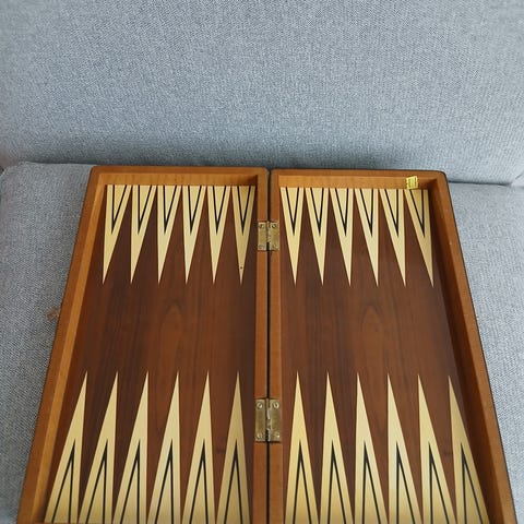 Backgammonspel tillverkat i trä med klassisk design i bruna, beige och svarta färger. Spelet innehåller tärningar, pjäser och två muggar för tärningarna. Passar för spelare som vill spela backgammon i ett bärbart och traditionellt format.
