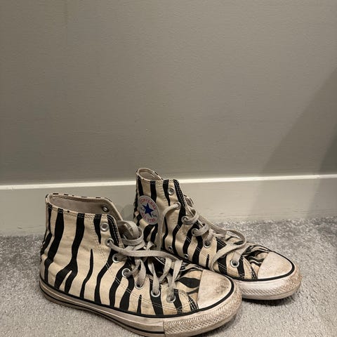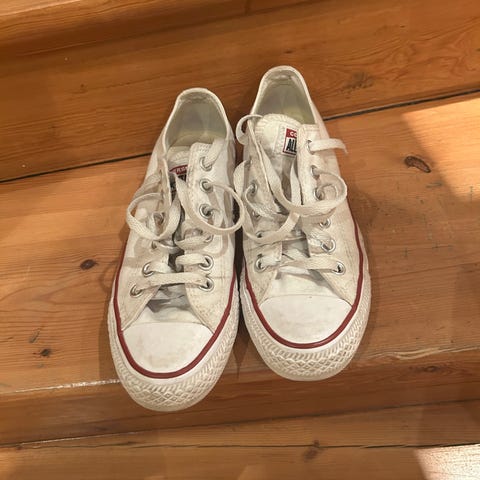 Vita Converse i använt skick. Slitage i hälarna, men fungerar bra att använda med iläggssula. I övrigt hela och redo för fler steg.