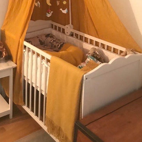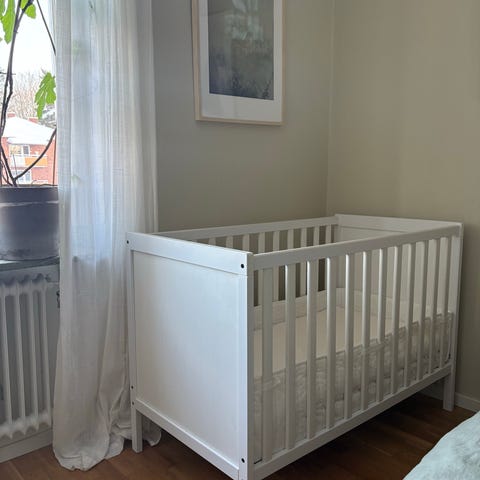Hensvik spjälsäng i vitt trä säjls, fint skick. Madrass och lakan ingår.