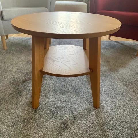 Gediget ovalt soffbord i massiv ek, som i nyskick. Namn på soffbordet Madrid. Mått: 140 L, 80 B, 52 H.