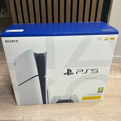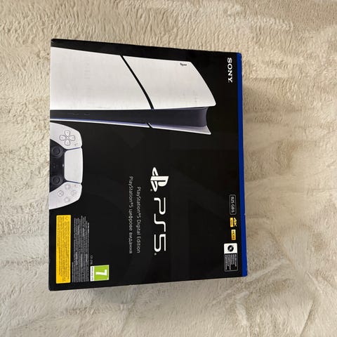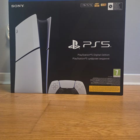 Sony PlayStation 5 Slim Digital spelkonsol i vit färg. Produkten inkluderar handkontroll och kablar.