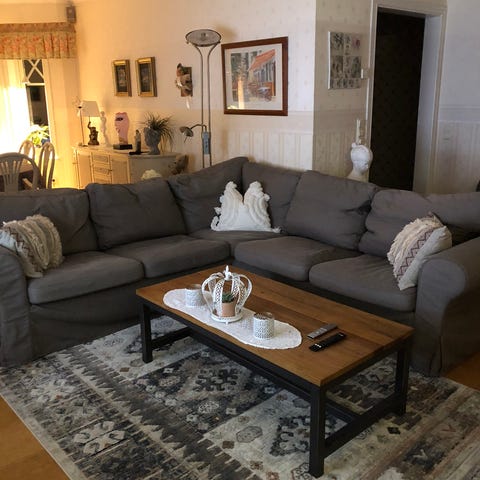 Soffan är i bra skick, inga skador. Stora dynan och en kudde är solblekt och några fläckar på armstödet.
