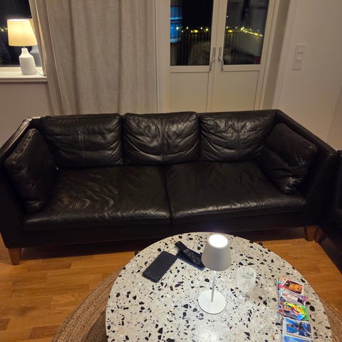Säljer en tresits skinnsoffa med två fåtöljer och en fotpall. Bra skick.