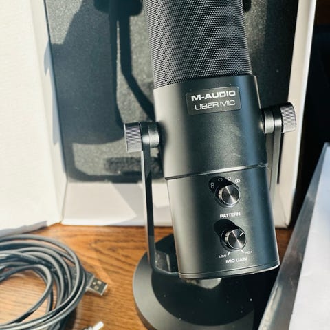 Nikabe M5 mikrofon inklusive stativ och tillbehör. Mikrofonen är designad för ljudinspelning med kontroll för gain och direktmute-funktion. Produkten levereras i originalförpackning med manual och kablar.