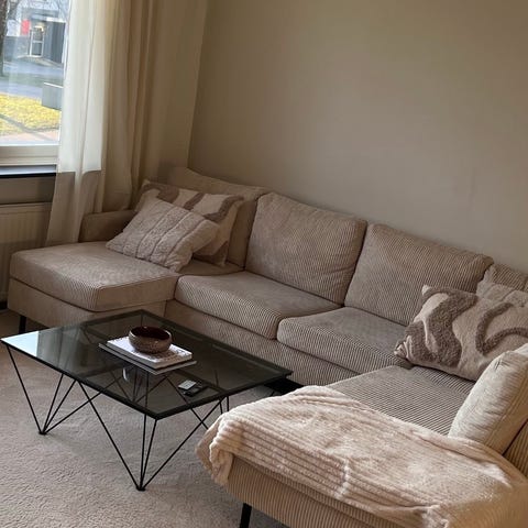 Prydnadskuddarna följer inte med, allt på bilderna utan prydnadskuddar följer med. Finns även ett oöppnat armstöd till andra sidan soffan som följer med.