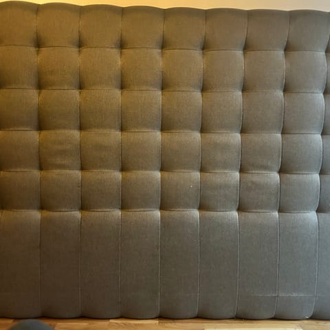Sänggavel i grått tyg med stoppad yta och knappdetaljer. Passar sängar med bredden 210 cm. x170 cm. grå ny pris var 3500 kr. nu 600 kr. vid snabb affär .