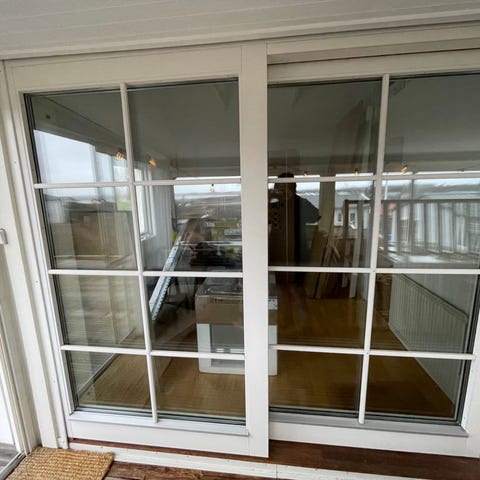Skjutdörr i vitt trä med spröjs.