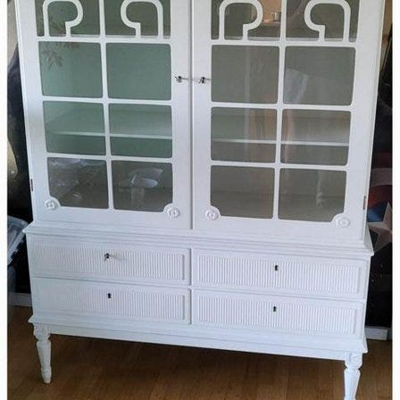 Fynda! Ett Vitrinskåp med glasdörrar och lådor. Skåpet har flera förvaringsutrymmen inklusive hyllor bakom glasdörrar samt öppna fack. Skåpet är lämpligt för förvaring och display av föremål i vardagsrum eller matsal.