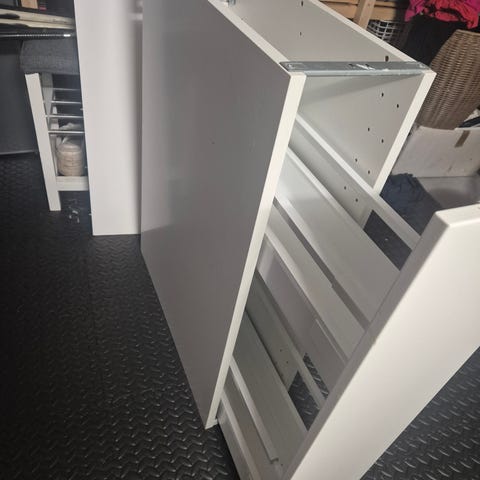 Köksskåp i vitt utförande. Skåpen är avsedda för köksförvaring och monteras på vägg. Nedre raden är 74 lång och övre raden är 70 cm. Luckorna och stomme är i bra skick förutom baksidan i en av hyllplanen som syns på bilden.