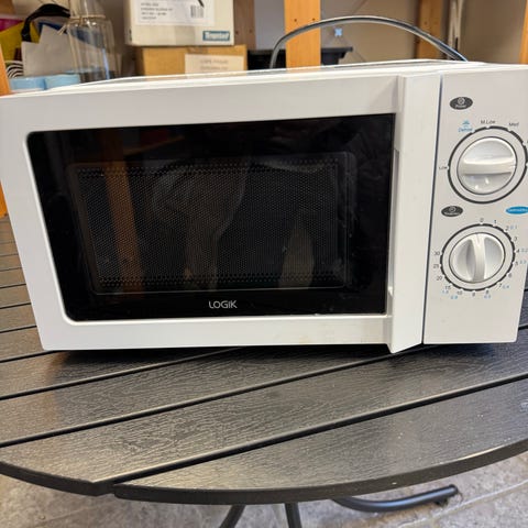 En mikrovågsugn i vit färg. Utrustad med två rattar för inställning av effekt och tid. Passar för uppvärmning och tillagning av mat i köket.
