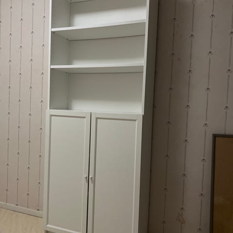 Billy bokhylla, 40 cm med vitrindörr. Några år på nacken men i gott skick. Troligen björkfanér.