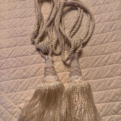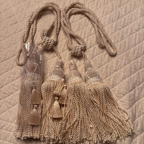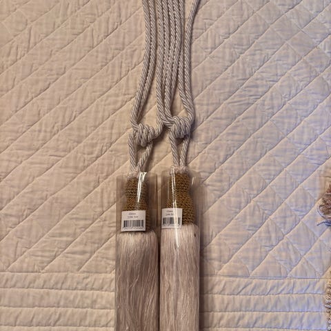 Ett gediget och dekorativt par gardinomtag i tvinnat material med klassisk knut och tofs. Ger ett elegant och ombonat uttryck och passar lika fint i klassiska miljöer. Välgjorda med tydlig känsla av kvalitet.