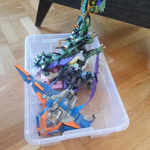 Lego, lite ofärdiga byggen, samt en låda med specialdelar, till exempel mycket hjul, fönster m.m. Pris- 1000kr