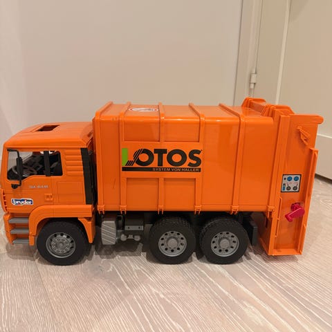 En stor och fin lastbil i mycket bra skick från Bruder. Flertalet funktioner samt två soptunnor som kan fästas på krokar baktill.