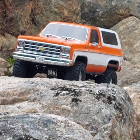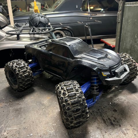 Traxxas E-Revo radiostyrd bil, 4-hjulsdriven, antisladdsystem (TSM) med många reservdelar. Stora modellen, nästan 60cm lång. Helt grym RC-bil med mycket bra stötdämpning/fjädring och en toppfart på 115kph enligt TRAXXAS vid 6S. Några skavanker men fungerar utmärkt, endast körd på 4S (toppfart ~80kph).