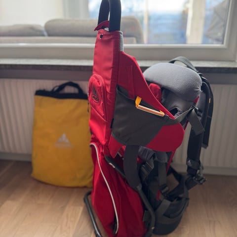 Väldigt bekväm för både vuxen och barn. Den har justerbara remmar och vaddering för att ge stöd och komfort. Sparsamt använd.
