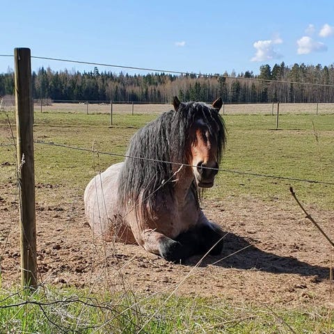 Super snällt Ardenner sto. Hon är snäll i all hantering, inkörd med både vagn och släde. Och fungerar lika bra i körning som ridning. Hon gillar att bada. Kan köpas med olika tillbehör som sadel träns täcke osv.