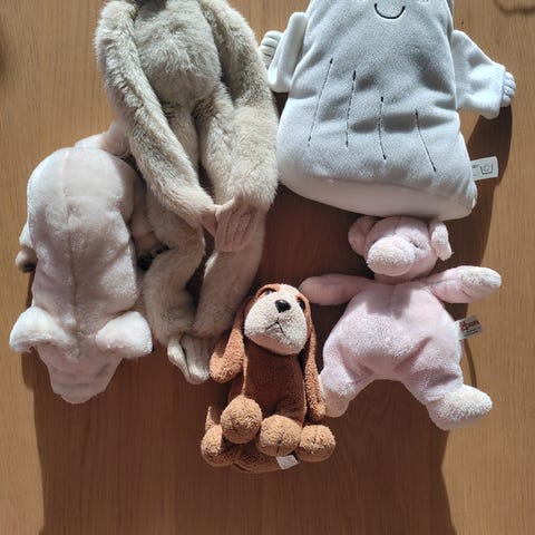 Tre mjukisdjur i olika färger: beige, blå och grå. Varje mjukisdjur har öron och är tillverkade i mjukt material. Passar som samlarobjekt eller leksak. Fake