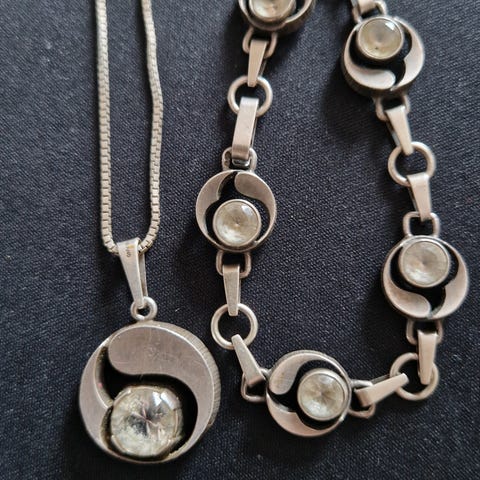 Swarovski smyckeset för kvinna tillverkat i stål och kristall. Setet består av ett halsband och matchande örhängen med cirkulära detaljer och infattade kristaller.
