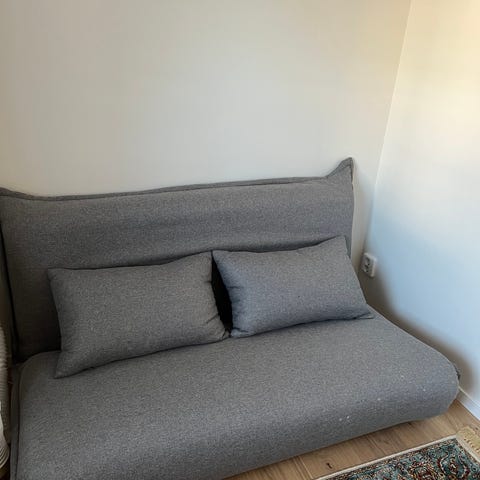 Sitsen ”flippas upp” till en säng knappt 100 cm bred. Tyget har spruckit på ena armstödet enligt bild, men långt bak så syns inte. Tyg från kuddarna kan kanske användas för att laga.