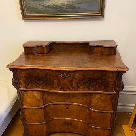 Byrån är i bra begagnat skick med normalt bruksslitage. Passar perfekt i sovrum, hall eller vardagsrum för dig som vill ha en möbel med klassiskt uttryck och god kvalitet.