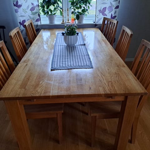 Snyggt och rejält ekbord med fyra tillhörande klädda stolar. Inköpt i början av år 2000 från inredningsbutiken Silo i Skövde.