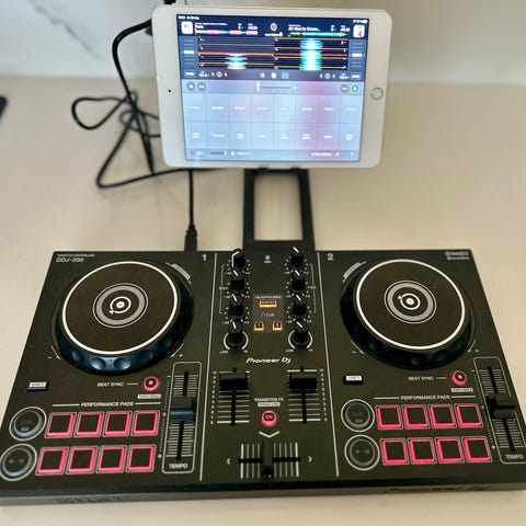 Pioneer DJ DDJ-400 DJ-kontroller med två jogghjul, mixersektion och flera kontrollknappar. Enheten är designad för DJ-användning och erbjuder grundläggande funktioner för mixning och musikhantering. Med originalförpackning och usb-c sladd till dator