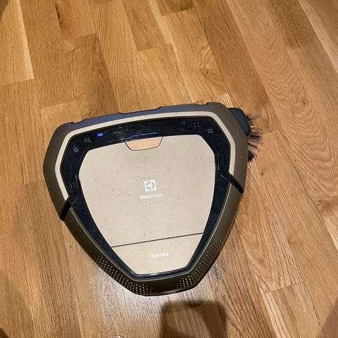 Dreame robotdammsugare i vit färg. Enheten är designad för automatiserad golvrengöring med roterande borstar och dammsugningsfunktion.
