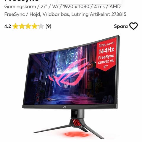 Säljer min ASUS ROG Strix XG27VQ 27-tums gaming-skärm i gott skick. Skärmen levererar en jämn och snabb bild med 144 Hz uppdateringsfrekvens och passar både gaming och vardagsanvändning. Monitorarm ingår, vilket gör det enkelt att justera skärmen efter din setup.
