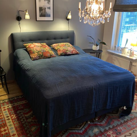 160 cm kontinentalsäng med svart tygklädsel. Sängen har en mörk tygklädsel och är utrustad med ben i metall. Madrassen är fast. Alldeles för hård för mig. Inga fläckar eller liknande. Som ny! Sänggavel ingår.