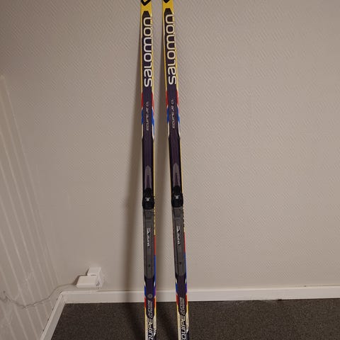 Oneway längdskidor utrustade med Salomon-bindningar och stavar.
