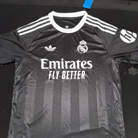 Adidas performance Juventus jersey, med tre vita ränder på ärmarna och en guldfärgad logotyp på bröstet. Tröjan har ett mönster av vertikala ränder och en rund halsringning med guldfärgade detaljer.