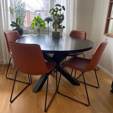 Runt matbord Mario från Mio med 6 stolar Isak. Bordet har svartlackerade ben och vit bordsyta med svart kant. Bordets diameter är 110 cm. Stolarna är av svart polypropen med grå stoppad tygsits och svarta metallben. Matgruppen inköpt 2021.
