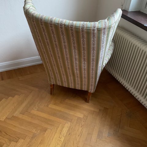Mörkgrå öronlappsfåtölj, träben.