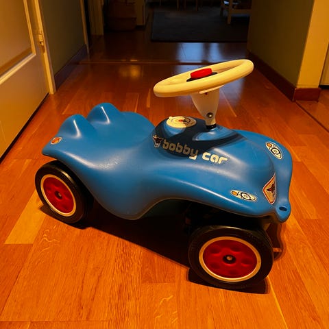 BRIO Bobby Car sparkbil med vagn i mörk grå färg. Leksaken är utformad för barn och har ett säte och ratt som är anpassade för små användare. Produkten är tillverkad av plastmaterial och är avsedd för inomhus- och utomhuslek. Använd av ett barn, rök- & djurfritt hem. Extra hjulinsats medföljer se tredje bilden