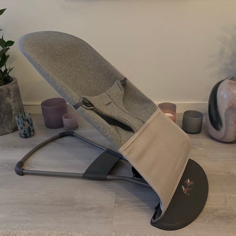 Babybjörn Barnstol i grått tyg. Solblekt tyg men annars i bra skick. Lekbåge ingår.