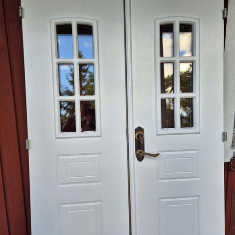 Dörrarna är utåtgående med höger dörr (inifrån sett) som huvuddörr. Vänster dörr har inget handtag och lossas med spärrar. Låsbar kattlucka i vänster dörr. Skicket framgår av bilderna. Det finns små skavanker men inget som inte går att fixa med lite färg.