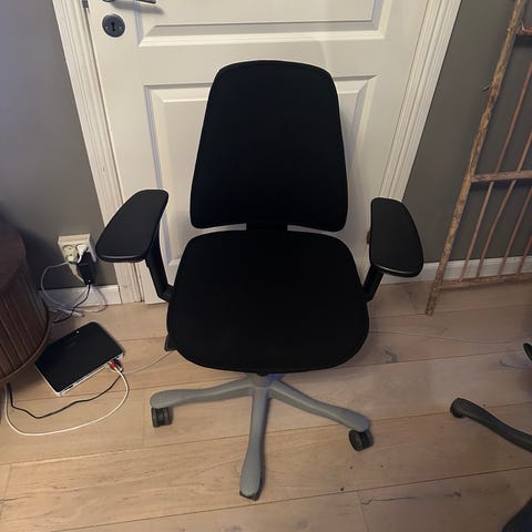 Kontorsstol i svart färg. Stolen är utformad för kontorsbruk och har justerbara armstöd och nackstöd för ergonomiskt stöd. Materialet är extremt skön antracit (lite som mocka) och konstruktionen inkluderar hjul för enkel förflyttning.