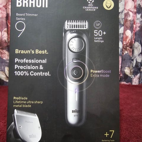 Braun hårtrimmer med flera kamtillbehör och laddare. Trimmern är svart med grå detaljer och levereras i ett fodral med plats för tillbehör. Passar för trimning av hår och skägg.