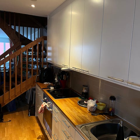 Kök med bänkskivor, diskho o blandare, lådor luckor, vitrinsluckor, underskåp i standardhöjd och djup. Se bilder.